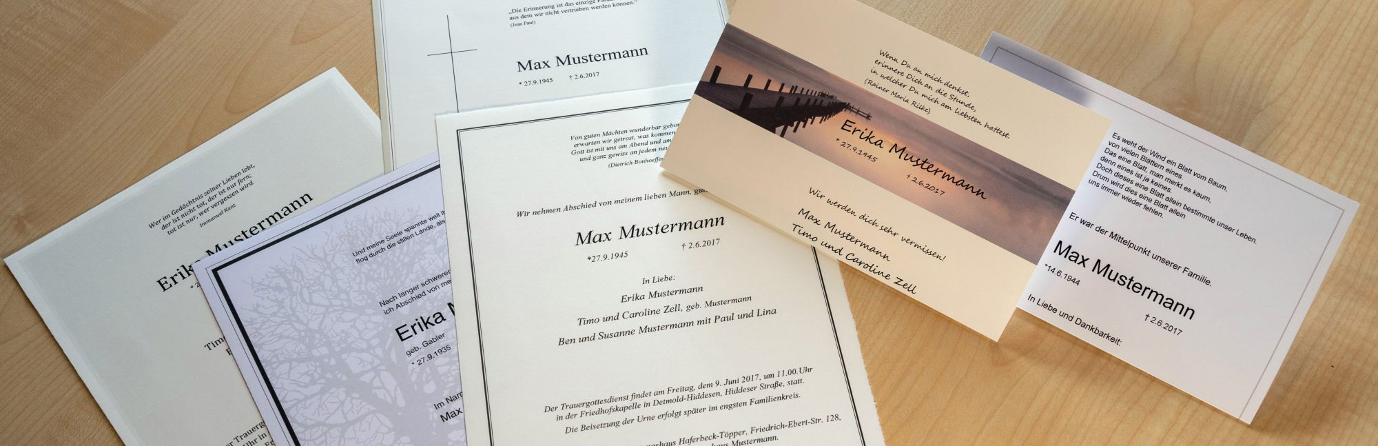 Neben den notwendigen Informationen entscheiden allein Sie über weitere Texte und die Gestaltung. Wünschen Sie sich ein bestimmtes Zitat oder beispielsweise eine passende Liedzeile? Sprechen Sie mit uns über Ihre Vorstellungen. Wir beraten Sie über die verschiedenen Möglichkeiten, helfen bei der Auswahl von Sprüchen, Symbolen und Motiven – wie auch bei der Papiersorte.